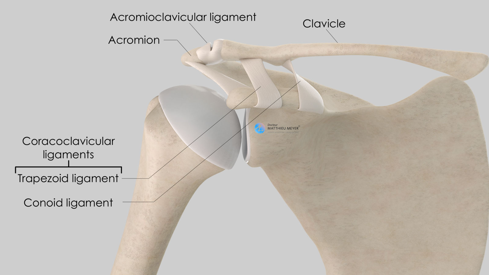 - The acromioclavicular ligament connecting the lateral end of the clavicle to the acromion